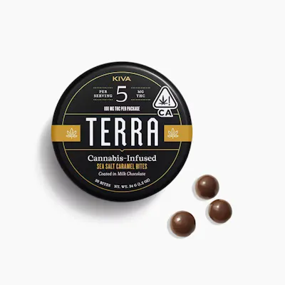Doses: 100 MG -- Sea Salt Caramel Terra Bites boast delicious, rich and smooth caramel centers coated in creamy milk chocolate and sprinkled with Pacific sea salt. These bites have a sweet, buttery flavor that finish with a salty kick.?Ingredients: Milk Chocolate (Sugar, Cocoa Butter, Milk, Cocoa Mass, Sunflower Lecithin, Vanilla), Tapioca Syrup, Sugar, Cream (milk), Palm Kernel Oil, Sea Salt, Gum Arabic, Cannabis Extract, Natural Flavors, Confectioner's Glaze, Sucrose, Glucose Syrup. Contains milk. Made in a facility that processes nuts, soy and gluten. (License No. CDPH-10002402)