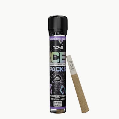 Rove 1G Ice Pack Preroll, the world’s first triple-infused preroll. Made with premium-grade flower fully-infused with THCA diamonds and solventless ice hash rosin, expertly rolled and coated in more ice hash. Super smooth and ultra potent, Rove Ice Packs test up to 50% THC. Welcome to the next evolution of prerolls. BLUEBERRY KUSH This powerful indica strain provides an almost immediate calming sensation and deep relaxation with sweet berry tones, helping you take on the day or catch some much-needed shut-eye.