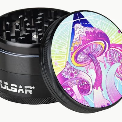 These hardtop grinders come apart into four separate pieces, including a sifting screen that leads to a pollen chamber. Magnetic lid closure ensures the contents stay safely secured. The Melting Shrooms design features a trippy purple mushroom trio.