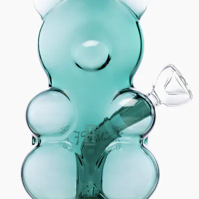 Oh, you need to check out this super playful Gummy Bear Bong! It's like smoking out of a sweet gummy treat. The teal color gives it that tropical candy vibe, and you actually smoke from its ear – talk about cute! It's compact, iconic, and adds a touch of candy-filled joy to your sessions. SPECS: Height: 6.6" Diameter: 3.9" Percolator: Diffused downstem Thickness: 5mm Gummy Bear Body (Teal Glass) Recessed 14mm Joint in Shoulder Cool Bong Micro & Mini Bong Cheap Bong