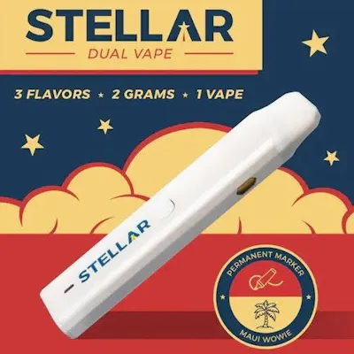 The STELLAR 2g All-In-One Vape is more than just a device—it’s a versatile and innovative tool for your cannabis journey. Featuring two distinct 1-gram cartridges that can be consumed individually or blended for a custom experience, it’s a game-changer in convenience and customization. Whether you’re seeking relaxation, focus, or the best of both worlds, STELLAR delivers it all with unmatched quality and style. - Supercritical CO2 extraction to produce CO2 crude. The crude is dissolved in ethanol, frozen, and filtered to remove the fats and waxes. The ethanol is recovered through rotovap, the oil is decarboxylated, and then distilled to isolate the cannabinoids. - Side A: Permanent Marker Lineage: (Biscotti x Sherb Bx) x Jealousy Flavor/Aroma: Floral, Soap, Candy, Gas Effects: Euphoric, Creative, Relaxed Named in 2023 as Leafly's Strain of the Year, Permanent Marker is bold, complex, and utterly unforgettable, resulting in a vape with a smooth, layered profile that intrigues with every pull. The effects are just as captivating— expect a creative, cerebral high that inspires while keeping you blissfully at ease. Whether you're lost in artistic expression or deep in thought, Permanent Marker leaves a lasting impression, just like its name suggests! - Side B: Maui Wowie Flavor/Aroma: Tropical, Mango, Pineapple Effects: Energizing, Euphoric, Social Escape to paradise with Maui Wowie, a legendary strain inspired by classic Hawaiian genetics, this vape embodies the essence of a sun-soaked island retreat, offering a smooth, refreshing inhale with every puff. Its energizing, euphoric effects make it the perfect companion for artistic pursuits, outdoor adventures, or simply adding a little sunshine to your day. Let Maui Wowie take you on a flavorful getaway that sparks creativity and lifts your spirits. - Middle Blend: A Lasting Tropical Fusion Switch to the middle setting and experience the ultimate fusion of Permanent Marker’s bold, gassy sweetness with Maui Wowie’s tropical brightness. This perfect balance of rich funk and fruity paradise creates a vaping experience that is both uplifting and smooth, delivering waves of creativity, relaxation, and pure island bliss. It’s an unforgettable journey—one puff at a time.
