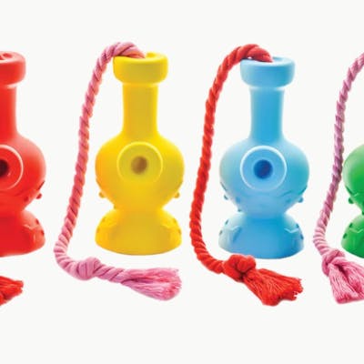 Ready to pup, pup, pass?! While you enjoy your pipe, let your pooch feel included! The Tug & Toke Water Pipe Dog Toy from Puff Palz is shaped like a bubble base water pipe with a tasty bone prints. Made from non-toxic rubber material, the toys have an attached rope for all canines and owners who love a game of tugs. Colors vary.