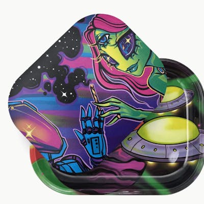 Spooky Girl Art's "Space Lovers" design is now available on rolling trays, perfect for adding a touch of galaxy and creativity to your rolling setup. This compact tray rolling accessory features a 5" x 7" tray with a magnetic cover, keeping your materials secure while highlighting Spooky Girl's unique art. Features: - Compact Size: 5" x 7" tray for easy handling and portability. - Magnetic Cover: Secure your materials and prevent spills with ease. - Durable Design: Ideal for organizing, and keeping everything in place. - Unique Artwork: Spooky Girl Art's "Space Lovers" design depicts Alien Love & the wonders of Space