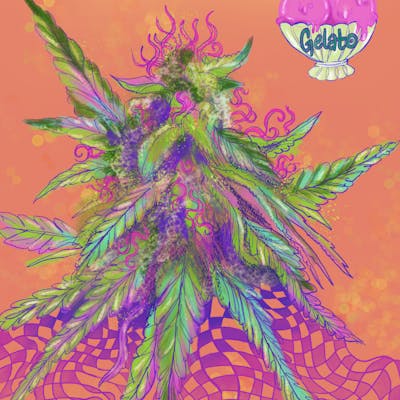 Drawing of Gelato cannabis with orange backround and pink & orange checkered base