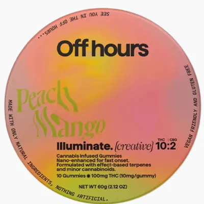 SATIVA: SPECIAL BLEND FOR CREATIVE 10 x 10mg per unit 10mg per serv.: 100mg per serv. Vegan friendly and gluten free. OFFHOURS peach mango flavored gummies are formulated with a unique combination of THC and CBG to inspire a creative high. Sweet dreams. Nano-enhanced cannabinoids for fast onset. OUR PEACH MANGO FLAVORED GUMMIES ARE FORMULATED WITH A UNIQUE COMBINATION OF THC AND CBG TO INSPIRE A CREATIVE HIGH. NANO-ENHANCED CANNABINOIDS FOR FAST ONSET. INGREDIENTS: Organic Cane Sugar, Reverse Osmosis Water, Organic Tapioca Syrup, Organic Fruit Juice From Concentrate, Fruit Pectin, Organic Fruit Flavoring, Natural Food Coloring, MCT Oil, Cannabis Extract, Soy Extract, Terpenes