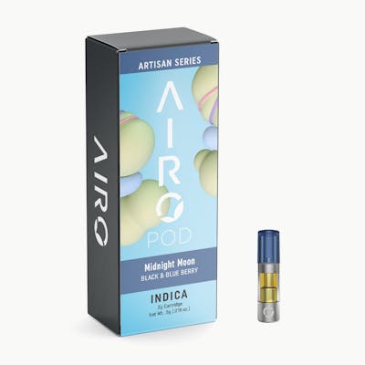 Total Cannabinoids: 78.98% | Delta 9-THC: 78.32% | CBN: 0.66% | | Alpha-Humulene: 0.03% | Alpha-Pinene: 0.06% | Beta-Myrcene: 1.17% | Beta-Caryophyllene: 0.28% | Beta-Pinene: 0.07% | Caryophyllene: 0.03% | Limonene: 3.48% | Linalool: 0.06% | Terpinolene: 0.66% | Total Terpenes: 5.92% | Other Terpenes: 0.09% -- Manifest your desires at the end of your day with the Artisan Series Midnight Moon. As the moon rises, inhale the moonlight and unveil your true self. Nourish your palate with tastes of freshly picked blackberries and blueberries. As you exhale, fill the air with grounding, juicy aromas and let yourself immerse in alleviation. This Indica aligns you with the moon and reveals your inner tranquility for a relaxed and peaceful state. Our Artisan Series, made from purified cannabis oil, is our exclusive fusion of trademarked tastes, derived 100% from naturally occurring botanical terpenes. Arouse your palate with vapor full of colorful fruit, floral, and savory notes. Inhale for enticing tastes, and exhale to fill the room with sensational aromas. AiroPod Cartridges are only compatible with the AiroPro and AiroSport Vaporizer.