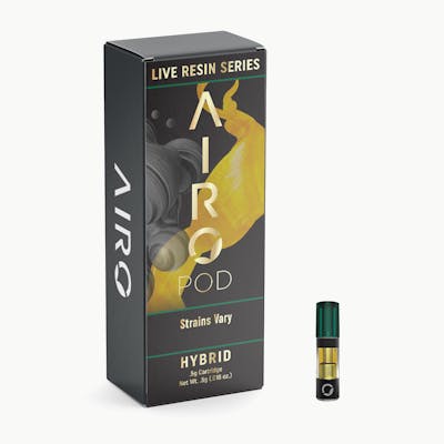 Total Cannabinoids: 69.18% | Delta 9-THC: 69.10% | CBN: 0.08% | | Alpha-Bisabolol: 0.08% | Alpha-Humulene: 0.56% | Alpha-Pinene: 0.38% | Beta-Myrcene: 2.55% | Beta-Caryophyllene: 1.61% | Beta-Pinene: 0.44% | Caryophyllene: 0.04% | Cis-Ocimene: 0.02% | Limonene: 2.50% | Linalool: 2.74% | Terpinolene: 0.09% | Total Terpenes: 12.33% | Other Terpenes: 1.32% -- Smooth, fierce, and full-spectrum. Our Live Resin series is made for those that want a delicious, hard-hitting cannabis vaping experience. Crafted with 100% live resin, each Hybrid strain contains the original cannabinoid and terpene profile from live, freshly frozen plants. Prepare for maximum flavor and maximum effects, with none of the extra additives. AiroPod Cartridges are only compatible with the AiroPro and AiroSport Vaporizer.