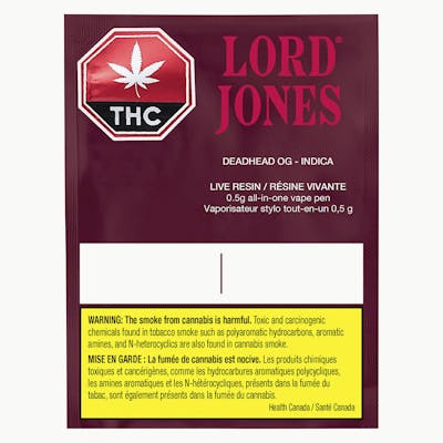 Lord Jones - Pure Live Resin Vape - Deadhead OG AIO Disposable - Indica - 0.5g