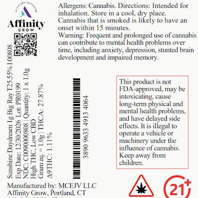C0090000808 // Sunshine Daydream Big Ray Pre Roll Dominance: Indica ----- THCA 27.87% // THC 25.55% Flower Equivalent: 1g Expiration Date: 12/30/2026 ----- Lineage: Bubbashine x Appalachia ----- Meet The Big Ray, our new 1g pre-roll debuting with none other than Sunshine Daydream—ranquil indica, a dreamy union of Bubbashine and Appalachia, layers creamy berry sweetness, bright citrus zest, and a grounding touch of pine on every pull. Packed with dense, trichome-rich flower, this full-gram pre-roll delivers a smooth, flavorful session loaded with sweet funk, creamy mint, and gassy depth. Named in honor of one of our founding families, The Big Ray carries on the legacy of quality and character that started it all. Whether you're flying solo or passing it around, this pre-roll is built to deliver big on flavor, form, and story.