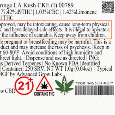 LA Kush CKE Oral Syringe THC 77.42% // 774.2mg Total THC Flower Equivalent: 3.17g Expiration Date: 2/25/2026