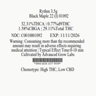 C0010001092 // 3.5g Black Maple 22 Whole Flower Dominance: Indica ----- THCA 32.31% // THC 29.11% Flower Equivalent: 3.5g Expiration Date: 11/11/2026 ----- RYTHM Premium Flower offers a variety of expertly cultivated and meticulously cured strains with optimal potencies, lush aromas, and rich flavors. ----- Visit your nearest Trulieve dispensary to discover an amazing variety of brands and products and explore our full range of premium cannabis products. Each offering is designed with quality and patient care in mind, ensuring you receive the relief and consistency you deserve—supported by a compassionate team ready to guide your wellness path. Our knowledgeable team is here to help you choose the perfect fit for your needs while helping you explore additional cannabis options that align with your preferences and wellness goals.
