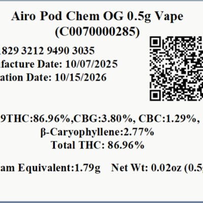 C0070000285 // 500mg Chem OG Pod by Airo Dominance: Indica ----- THC 86.96% Flower Equivalent: 1.79g Expiration Date: 10/15/2026 ----- Visit your nearest Trulieve dispensary to discover an amazing variety of brands and products and explore our full range of premium cannabis products. Each offering is designed with quality and patient care in mind, ensuring you receive the relief and consistency you deserve—supported by a compassionate team ready to guide your wellness path. Our knowledgeable team is here to help you choose the perfect fit for your needs while helping you explore additional cannabis options that align with your preferences and wellness goals.