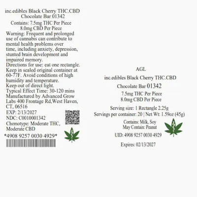 C0010001342 // Black Cherry THC/CBD Bar Dominance: Hybrid ----- 7.5mg THC/Chocolate 8mg CBD Flower Equivalent: 0.92g Expiration Date: 2/13/2026 ---- Allergen Warning: Contains Soy and Milk See Label for Ingredients