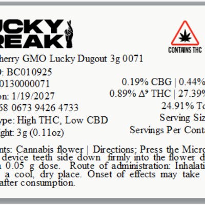 C0130000071 // 3g Black Cherry GMO Lucky Dugout Dominance: Indica ----- THCA 27.39% // THC 24.91% Flower Equivalent: 3g Expiration Date: 1/19/2027 ----- Introducing Lucky Dugout — a nod to old-school cannabis culture featuring 3 grams of whole flower in sleek, modern packaging paired with a MicroGrind one-hitter pipe. The dugout features pipe cleaning pegs and a press to open SnapTec hinge. Stuff it. Puff it. ----- Find this product and more at your nearest Trulieve dispensary. Our knowledgeable team is here to help you choose the perfect fit for your needs.