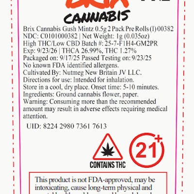 Brix Cannabis Gush Mintz Pre Rolls 24.94% (I) 1g 2 Pack - 00382