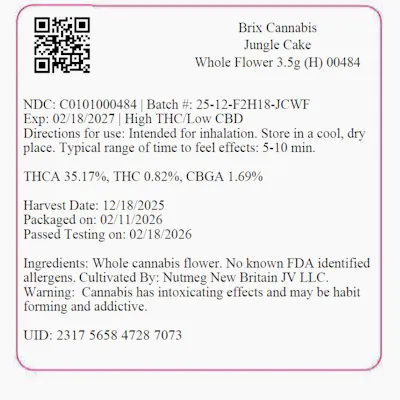 C0101000484 // 3.5g Jungle Cake Whole Flower Dominance: Hybrid ----- THCA 35.17% // THC 31.66% Flower Equivalent: 3.5g Expiration Date: 2/18/2027
