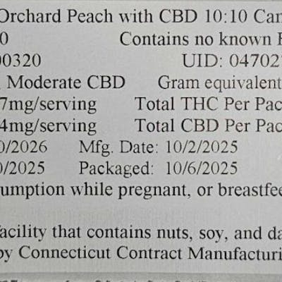 Hybrid Sours Orchard Peach Infused Gummies // 20 Pack 4.57mg THC/Gummy 4.84mg CBD/Gummy 91.40mg Total THC Flower Equivalent: 0.559g Expiration Date: 10/10/2026 Directions: Chew gummy, wait 15-60 minutes for onset. Store in a cool, dry place.