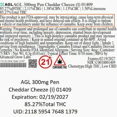 C0010001409 // 300mg Cheddar Cheeze Disposable Dominance: Indica ----- THC 85.27% Flower Equivalent: 1.06g Expiration Date: 2/19/2027 -----