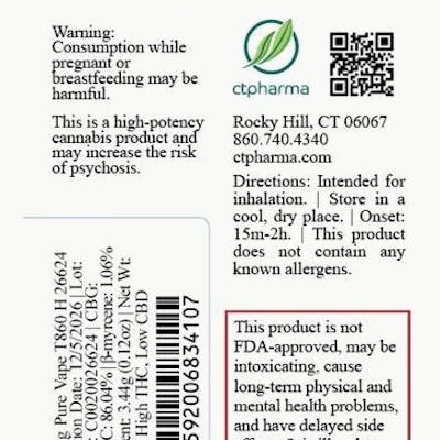 C0020026624 // 1g Chem-Band Vape Cartridge Dominance: Hybrid ----- THC 86.04% Flower Equivalent: 3.44g Expiration Date: 12/5/2026 ----- ----- Strain-specific oil delivering all the flavors of our best-selling CTPharma flower via food-grade ethanol extraction in a convenient cartridge. Pairs with any 510 thread vape battery. ----- Instructions: For vaporizing use only. Strength: Medium