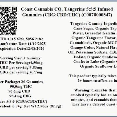 C0070000347// Tangerine 1:1:1 CBG:CBD:THC Infused Gummies 20pk Dominance: Indica ----- 4.50mg THC/Gummy 4.83mg CBD/Gummy 4.77mg CBG/Gummy Flower Equivalent: .74g Expiration Date: 12/8/2026 -----