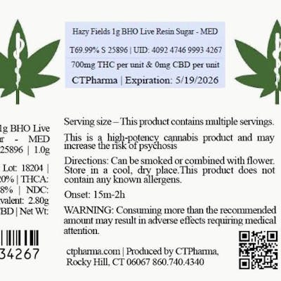 CTPharma Hazy Fields BHO Live Resin Sugar 69.99% (S) 1g - 25896