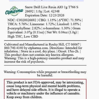 C0020026692 // 1g Snow Drift Live Resin AIO Dominance: Sativa ----- THC 76.64% Flower Equivalent: 3.07g Expiration Date: 12/23/2026 ----- Snow Drift is a sweet and creamy sativa strain. Fruity flavors engulf your mouth and nostrils when puffing on this hybrid strain. As a cross of Cookies, Cherry Pie, and Snowman, these dense nugs offer a potent high leading to body relaxation and a euphoric mindset. ----- Extracted from fresh-frozen flower, our Live Resin All-In-One captures the plant’s full spectrum of terpenes and cannabinoids for a grab-and-go, true-to-strain experience. This high-terpene hash oil ranges from light gold to nearly clear, boasting a vibrant flavor profile that mirrors the essence of a fresh dab with pungent clouds to match. Engineered with no-burn, even-heating technology, the Live Resin All-In-One delivers smooth draws and consistently bold hits.