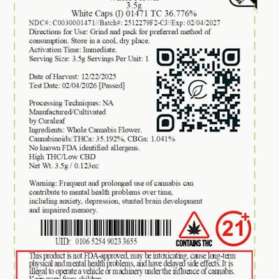 C0030001471 // 3.5g White Caps Whole Flower Dominance: Indica ----- THCA 35.19% // THC 31.17% Flower Equivalent: 3.5g Expiration Date: 2/4/2027 -----