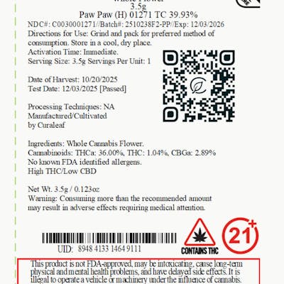 Curaleaf Paw Paw Whole Flower 32.61 % (H) 3.5g - 01271