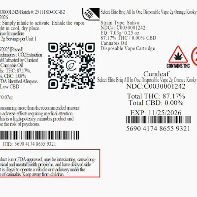 C0030001242 // 2000mgOrange Kookyz Briq Disposable All In One Dominance: Sativa ----- THC 87.17% Flower Equivalent: 7.03g Expiration Date: 11/25/2026 -----