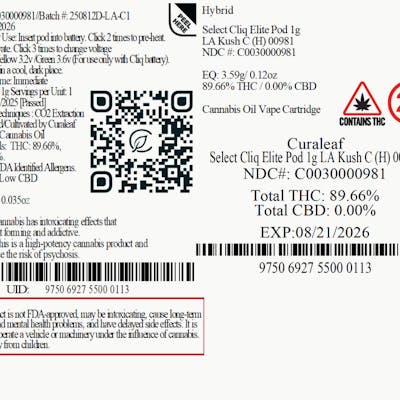 Curaleaf Select Elite LA Kush C Cliq Pod 89.66% (H) 1g - 00981