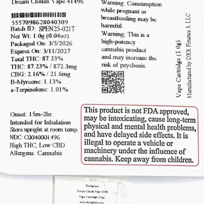 C0040001496 // 1000mg Dream Clouds Vape Dominance: Sativa ----- THC 87.23% Flower Equivalent: 3.49g Expiration Date: 3/11/2027 -----