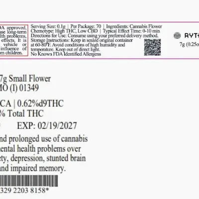 C0010001349 // 7 grams GMO Second Cut Flower Dominance: Indica ----- THCA 36.32% // THC 32.47% Flower Equivalent: 7g Expiration Date: 2/19/2027