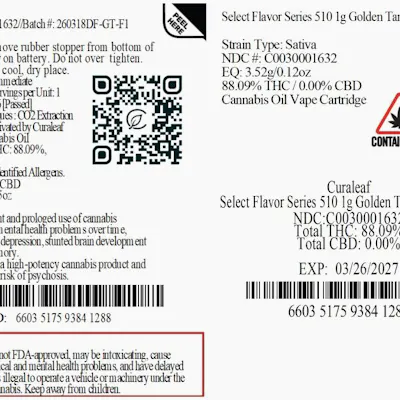 C0030001632 // 1g Flavor Series Golden Tangie Vape Cartridge by Select Dominance" Sativa ----- THC 88.09% Flower Equivalent: 3.52g Expiration Date: 3/26/2027 -----