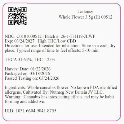 C0101000512 // 3.5 grams Jealousy Whole Flower Dominance: Hybrid ----- THCA 31.64% // THC 29% Flower Equivalent: 3.5g Expiration Date: 3/24/2027 -----