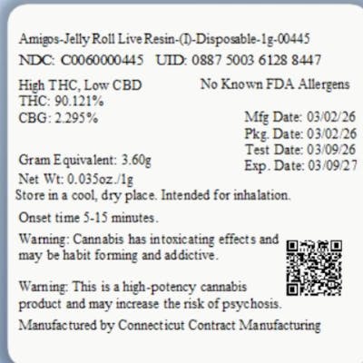 C0060000445 // 1000mg Jelly Roll Live Resin Disposable Vape Dominance: Indica ----- THC 90.12% Flower Equivalent: 3.60g Expiration Date: 3/9/2027 ----- Amigos is a curated vaping experience where complementary flavors meet in perfect balance. Each 1g tank brings its own distinct profile—bold, smooth, sweet, or tart—designed to pair effortlessly through a sleek magnetic connection. With a satisfying click, two become one in this personalized product line. Allowing you to Build Your Own Dual tank, creating a layered, harmonious blend as elevated as your standards. 260mah battery, ceramic coil, USB-c charging port.