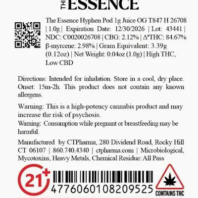C0020026708 // 1000mg Juice OG Hyphen Pod ----- THC 84.67% Flower Equivalent: 3.39g Expiration Date: 12/30/2026