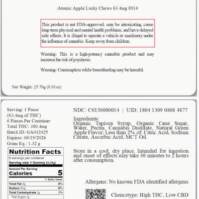 6 Hybrid Atomic Apple Lucky Chews 63.4mg THC per Chew // 380.4mg Flower Equivalent: 1.32g Expiration Date: 6/19/2026 Directions: Chew tablets thoroughly and swallow as directed.
