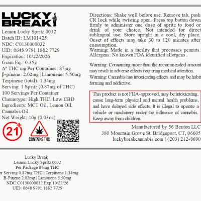 Cannabis Lemon Lucky Sprtiz .87mg THC/Spritz (100 servings Per Container) Flower Equivalent: .35g Expiration Date: 10/22/2026