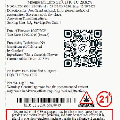 C0030001310 // 14g Hybrid Whole Flower ----- THCA 27.87% // THC 24.75% Flower Equivalent: 14g Expiration Date: 12/9/2026