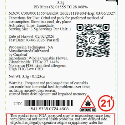 C0030001555 // 3.5g PB Bites Whole Flower First Cut THCA 27.14% // THC 24.09% Expiration Date: 3/6/2027