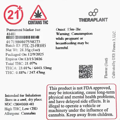 C0040001481 // Permanent Marker Second Cut Flower THC 21.07% // THCA 23.01% Expiration Date: 12/15/2026