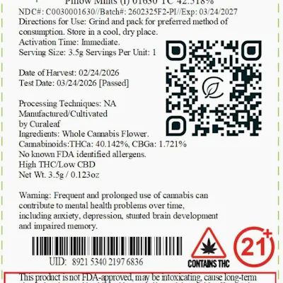 C0030001630 // 3.5 grams Pillow Mints Whole Flower by Grassroots Dominance: Indica ----- THCA 40.14% // THC 35.61% Flower Equivalent: 3.5g Expiration Date: 3/24/2027 -----
