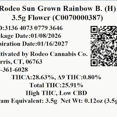 C0070000387 // 3.5g Rainbow B. Whole Flower Dominance: Hybrid ----- THCA 28.63% // THC 25.91% Flower Equivalent: 3.5g Expiration Date: 1/16/2027 -----