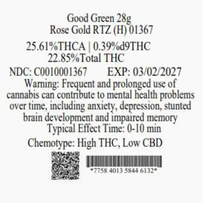 C0010001311 // Green Rose Gold RTZ Small Flower Dominance: Hybrid ----- THCA 25.61% // THC 22.85% Flower Equivalent: 28g Expiration Date: 3/2/2027 ----- Find this product and more at your nearest Trulieve dispensary. Our knowledgeable team is here to help you choose the perfect fit for your needs.
