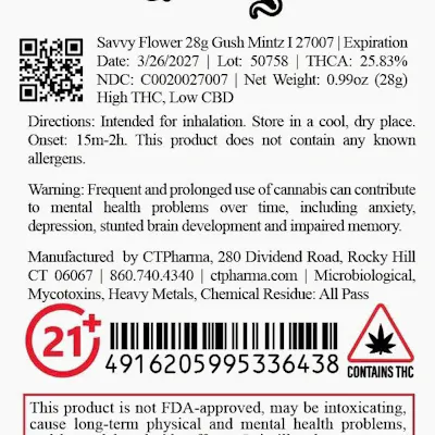 C0020027007 // 28g Gush Mintz Small Flower Dominance: Indica ----- THCA 25.83% // THC 22.92% Flower Equivalent: 28g Expiration Date: 3/26/2027 ----- 28G—the all-in. An ounce for the sesh-makers, stash-builders, and the always-stocked.