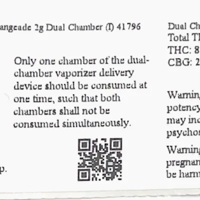 C0040001795 & C0040001796 // 2g Strawberry Sauce X Orangeade Dual Chamber Disposable Vape ----- Sativa Side Of 2g Dual Chamber Disposable THC 87.09% Flower Equivalent: 3.48 Grams Indica Side Of 2g Dual Chamber Disposable THC 87.05% Flower Equivalent: 3.48 Grams Expiration Date: 3/19/2027 -----
