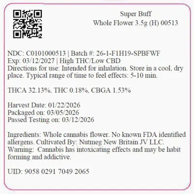 C0101000513 // 3.5 grams Super Buff Whole Flower Dominance: Hybrid ---- THCA 32.13% // THC 28.36% Expiration Date: 3/12/2027 ----