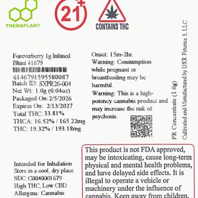 C0040001679 // 1g Foreverberry Infused Blunt ----- THCA 16.52% / THC 33.81% Flower Equivalent: 1.35g Expiration Date: 2/13/2027