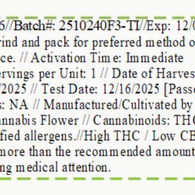 C0030001326 // 3.5g Sativa Whole Flower First Cut ----- THCA 34.52% // THC 31.55% Flower Equivalent: 3.5g Expiration Date: 12/4/2026
