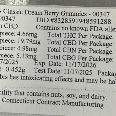 C0060000347 // Dream Berry Classic Gummies 93.2 mg C395.8mg C99.6mg C102.6mg 20pk Dominance: Indica ----- 4.66mg THC/Gummy 19.79mg CBD/Gummy 4.98mg CBN/Gummy 5.13mg CBG/Gummy Flower Equivalent: .452g Expiration Date: 11/17/2026 -----